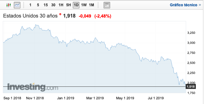 Este jueves el interés de la deuda estadounidense a 30 años ha caído por primera vez del 2%, una nueva señal de que el dinero se mueve hacia el mercado de bonos. El interés ha tocado un mínimo histórico en el 1,943%. Mientras tanto, el bono a diez años baja ligeramente al 1,54%, mientras que la deuda a dos años se negocia en el 1,51%.