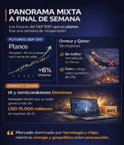 En Estados Unidos, los futuros del S&P 500 operan prácticamente sin cambios, luego de una racha de siete jornadas consecutivas de subas que dejó al índice encaminado a su mejor semana en casi un año. Aun así, el mercado sigue mostrando señales de cautela. El rebote acumulado se sostuvo, en gran parte, por cierre de posiciones cortas y no por una entrada clara de dinero nuevo, lo que vuelve al rally más vulnerable ante cualquier decepción en las conversaciones del fin de semana. El foco principal sigue puesto en la posibilidad de que el alto al fuego avance hacia un acuerdo más duradero, aunque persisten dudas relevantes por la falta de normalización del tránsito en el Estrecho de Ormuz y por los ataques continuos sobre infraestructura energética crítica.