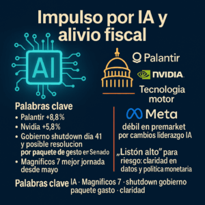 El impulso del lunes vino de un rally de inteligencia artificial (Palantir +8,8 %; Nvidia +5,8 %) y del optimismo por el fin del cierre del gobierno, que entró en su día 41 y podría resolverse tras el avance de un paquete de gasto en el Senado; en paralelo, se destacó la mejor jornada conjunta de los “Magníficos 7” desde mayo. En el frente de narrativas, un house view sitúa al S&P 500 en 7.500 puntos para 2026, sustentado en expansión de beneficios, con tecnología como motor central.