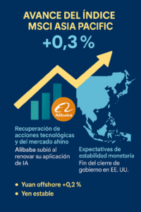 El índice MSCI Asia Pacific registró un avance del 0,3%, apoyado por la recuperación de acciones tecnológicas y del mercado chino. Alibaba subió tras anunciar la renovación de su aplicación móvil de inteligencia artificial con características similares a modelos conversacionales avanzados. En general, la región se benefició de expectativas de mayor estabilidad monetaria y de un entorno global más constructivo luego del fin del cierre de gobierno en Estados Unidos.En divisas, el yuan offshore se apreció 0,2% frente al dólar y el yen mantuvo un comportamiento estable. Desde Japón, autoridades monetarias reiteraron su monitoreo de movimientos bruscos en la divisa, en línea con mensajes recientes respecto a la volatilidad cambiaria.