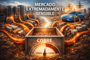 La electrificación global y la revolución de la inteligencia artificial amplifican este desequilibrio. Los centros de datos requieren cantidades masivas de cobre, la transición hacia vehículos eléctricos multiplica el uso del metal por unidad producida y la modernización de redes eléctricas obsoletas se ha vuelto ineludible, especialmente en economías desarrolladas. En este contexto, los inventarios disponibles se encuentran en niveles críticamente bajos: las existencias visibles representan menos de una semana de consumo global, mientras que parte del cobre ha quedado inmovilizado por acumulaciones estratégicas y distorsiones comerciales. La consecuencia es un mercado extremadamente sensible a cualquier shock adicional de demanda o interrupción de suministro.