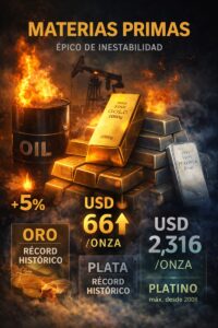 El epicentro del día se desplazó con claridad hacia los mercados de materias primas. El petróleo lideró las subas ante el riesgo de interrupciones en la oferta, no solo por Venezuela sino también por la posibilidad de nuevas sanciones estadounidenses al sector energético ruso si fracasan los esfuerzos diplomáticos. En este entorno, los metales preciosos consolidaron su rol defensivo: el oro avanzó hasta USD 4.316 por onza, acercándose nuevamente a sus máximos históricos, mientras que la plata superó los USD 66 por onza, marcando un nuevo récord histórico y ampliando su outperformance frente al oro, apoyada en una demanda industrial estructuralmente fuerte y un contexto de tasas reales más benignas. El platino también alcanzó niveles no vistos desde 2008, reforzando el protagonismo de los hard assets como receptores de flujos en un escenario de elevada incertidumbre geopolítica.
