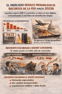 Ese movimiento energético vuelve a trasladarse de forma directa a renta fija. El Treasury a 10 años sube hasta 4,36% y el 2 años alcanza 3,83%, reflejando un nuevo repricing hacia tasas más altas por más tiempo. La presión ya no viene solo del crecimiento o del empleo, sino del temor a una reaceleración inflacionaria vía energía. El mercado reduce todavía más las probabilidades de recortes de la Fed hacia 2026, en un contexto donde gasolina por encima de 4 dólares por galón y petróleo en tres dígitos vuelven más difícil sostener la narrativa de desinflación limpia. El dólar se mantiene firme y sigue funcionando como refugio, mientras el oro no logra capturar plenamente ese rol por el alza simultánea de rendimientos reales.