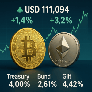 El mercado digital registró ganancias moderadas, acompañando el repunte de los activos de riesgo.El Bitcoin subió +1,4 %, alcanzando USD 111.094, mientras que el Ether (ETH) avanzó +3,2 % hasta USD 3.954.El repunte se atribuye a flujos institucionales vinculados a los ETF de criptoactivos y al mayor apetito por riesgo global. En renta fija, los bonos del Tesoro estadounidense a 10 años se mantuvieron en 4,00 %, mientras los rendimientos del Bund alemán subieron tres puntos básicos a 2,61 %, y los del Gilt británico permanecieron estables en 4,42 %. Los spreads de crédito corporativo se mantienen controlados, y el flujo hacia fondos de bonos de alta calidad continúa en aumento.