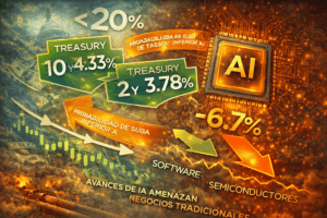 En renta fija, el ajuste es consistente con esta narrativa más constructiva. El Treasury a 10 años cae a 4,33% y el 2 años también retrocede, reflejando una moderación en las expectativas inflacionarias ante la caída del petróleo. El mercado ahora asigna una probabilidad inferior al 20% a nuevas subidas de tasas este año, en un giro relevante respecto a jornadas previas donde el shock energético dominaba completamente el pricing.Aun así, el trasfondo estructural sigue siendo desafiante. El informe destaca que el mercado viene de un deterioro importante en sectores clave —especialmente tecnología— donde el ratio software vs. semiconductores cayó 6,7%, uno de los peores movimientos en cinco años, en parte por avances de modelos de inteligencia artificial que amenazan negocios tradicionales. Este factor es independiente del petróleo y sugiere que la volatilidad reciente no es únicamente geopolítica, sino también estructural.