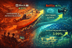 Se observa además una rotación violenta dentro del propio ecosistema tecnológico: desde hardware e infraestructura (chips y cómputo) hacia software y datos, bajo la tesis de “segunda fase” de la IA —menos foco en quién vende cómputo y más en quién captura productividad y monetiza adopción.