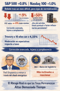 La conclusión es que el mercado está eligiendo, otra vez, leer el escenario optimista. Y hay razones para hacerlo: el posicionamiento era extremadamente defensivo, el daño en múltiplos ya fue considerable y la presión política para evitar una guerra más larga es real. Pero esa lectura convive con hechos que obligan a cautela: Irán sigue sin aceptar los términos, el Estrecho no está normalizado y aun una solución relativamente rápida dejaría precios energéticos altos durante algún tiempo. El rebote de hoy es válido, pero su sostenibilidad depende de una sola variable: que la desescalada pase del relato a la operativa
