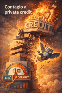 Esa corrección se filtró de inmediato a otras capas del sistema financiero. El ajuste no quedó contenido en acciones: se extendió a gestores alternativos y vehículos con exposición a software dentro de private credit, con caídas fuertes en nombres relevantes (por ejemplo, Blue Owl -13% y retrocesos de dos dígitos en otros administradores). En paralelo, estimaciones del sell-side ya incorporan un escenario en el que las tasas de default en private credit podrían escalar hasta 13% si la disrupción se acelera, lo que explica por qué la reacción del mercado ha sido más violenta y transversal que un simple “earnings miss”.