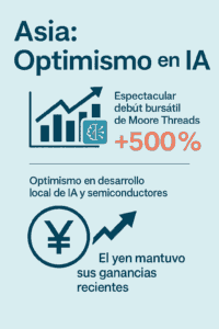 Los índices asiáticos cerraron con variaciones acotadas, dominados por el espectacular debut bursátil de Moore Threads en Shanghái (+500%), reforzando el optimismo en torno al desarrollo local de IA y semiconductores.El yen mantuvo sus ganancias recientes mientras el mercado continúa descontando la posibilidad de suba de tasas del Banco de Japón este mes.