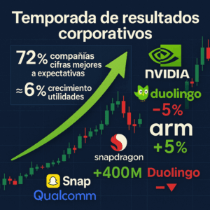 La temporada de resultados corporativos del trimestre se consolida como una de las más destacadas en años: cerca del 72% de las compañías reportó cifras superiores a las expectativas, con un crecimiento agregado de utilidades cercano a 6% trimestral, alcanzando nuevos máximos históricos. La mayoría de las empresas tecnológicas de gran capitalización mostraron crecimientos interanuales de dos dígitos y sorpresas positivas en sus beneficios. Nvidia es la única de entre las principales firmas tecnológicas que aún no publica cifras correspondientes al período. Entre casos puntuales, Arm Holdings avanzó más de 5% tras presentar proyecciones sólidas vinculadas a demanda de chips para aplicaciones de IA; Snap repuntó tras anunciar una colaboración de USD 400 millones con una firma emergente del sector; y Duolingo retrocedió tras reportes por debajo de lo esperado. Qualcomm cayó luego de advertir posibles pérdidas relacionadas con un cliente de gran peso en su cartera.