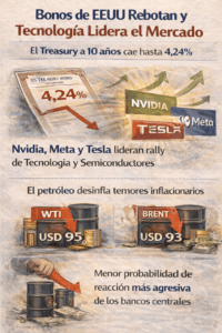 El cambio de tono vino del acuerdo alcanzado antes del deadline, con una reapertura coordinada del Estrecho de Ormuz por dos semanas y negociaciones formales convocadas para el viernes. Ese giro desarmó una prima de guerra construida a gran velocidad durante seis semanas: el WTI cae alrededor de 19% y el Brent cerca de 14%, una de las correcciones más violentas del crudo desde 2020. La baja del petróleo actúa inmediatamente sobre la narrativa de inflación, razón por la cual los bonos estadounidenses también rebotan y el Treasury a 10 años cae hacia 4,24%. En paralelo, los swaps OIS vuelven a descontar cerca de 60% de probabilidad de recorte de la Fed antes de fin de año, frente a una probabilidad prácticamente nula apenas 48 horas atrás.