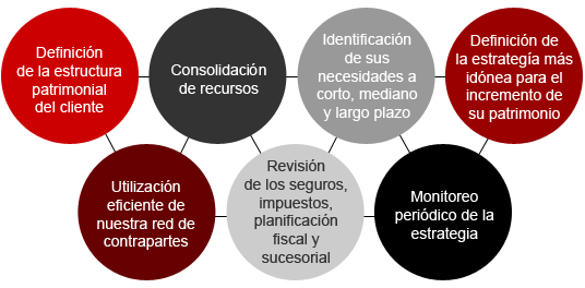 - El asesoramiento financiero con una infraestructura personalizada de los servicios de gestión patrimonial a la medida de las necesidades específicas, objetivos, circunstancias y a través de la implementación de la estrategias individuales.