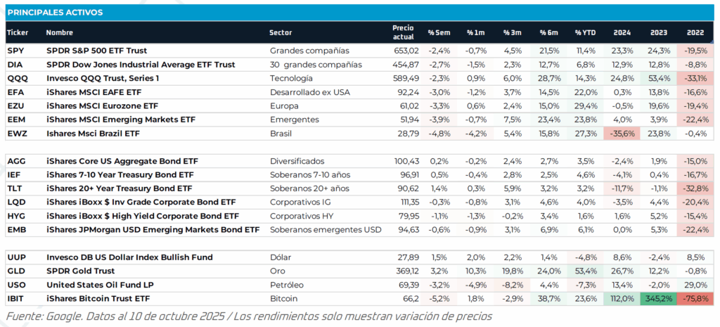 En renta fija, los bonos del Tesoro estadounidense mostraron recuperación moderada, con el TLT avanzando +1,4 % en la semana.