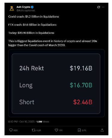 Esto derivó en un colapso instantáneo de USD 19.500 millones en liquidaciones, el mayor registrado hasta la fecha.