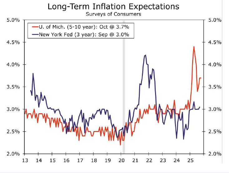 En cuanto a las expectativas de inflación, la última lectura de la Universidad de Michigan mostró que la previsión a largo plazo (5 a 10 años) se mantuvo en 3,7 % en octubre, ligeramente por encima del promedio histórico de 3,3 %, pero lejos del máximo de 4,4 % registrado en abril. Datos complementarios del Banco de la Reserva Federal de Nueva York apuntan a una estabilización tras el repunte de la primera mitad del año, impulsado por el anuncio de incrementos arancelarios. En síntesis, las expectativas inflacionarias han aumentado durante 2025, pero sin evidencias de desanclaje estructural.