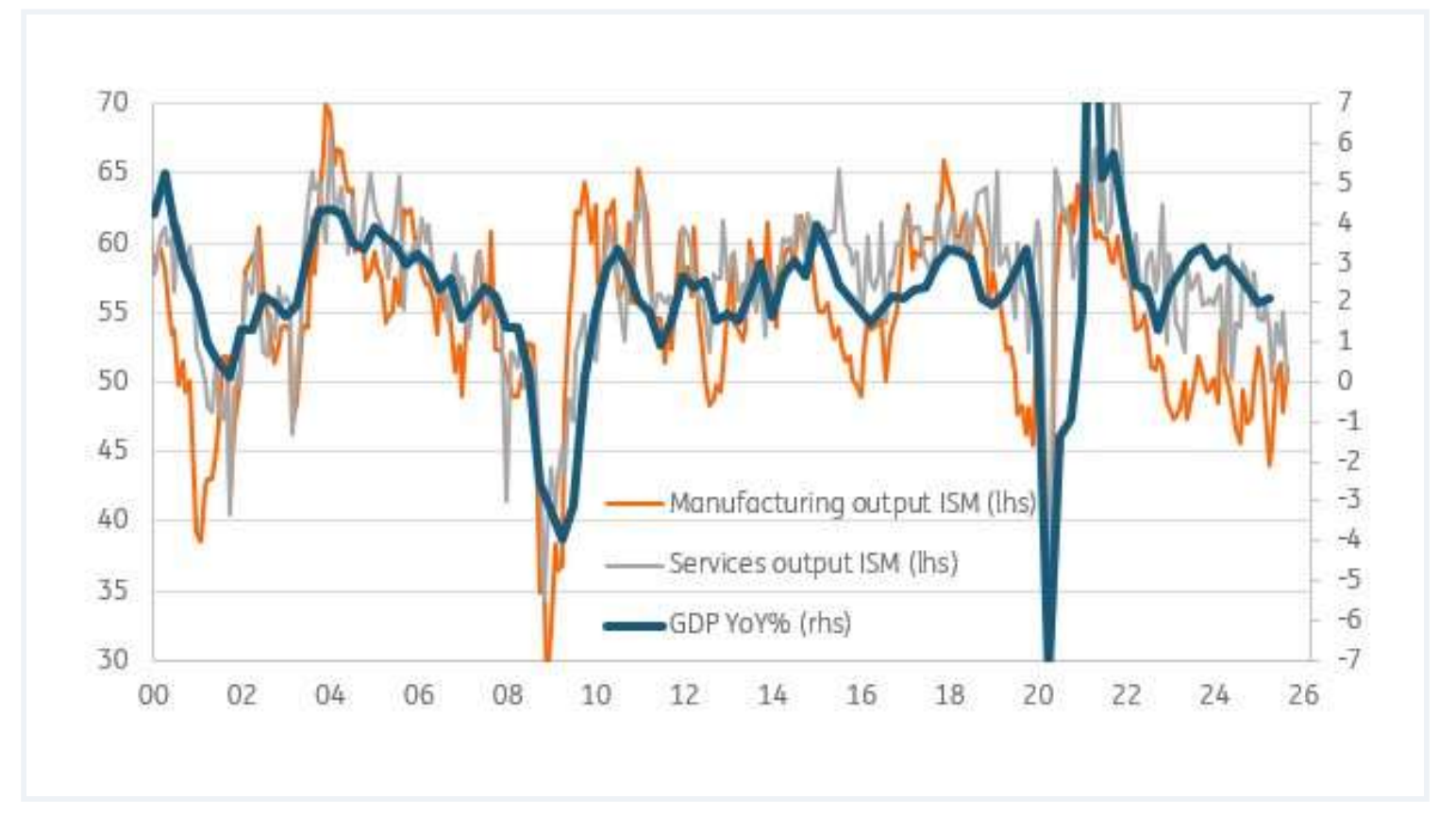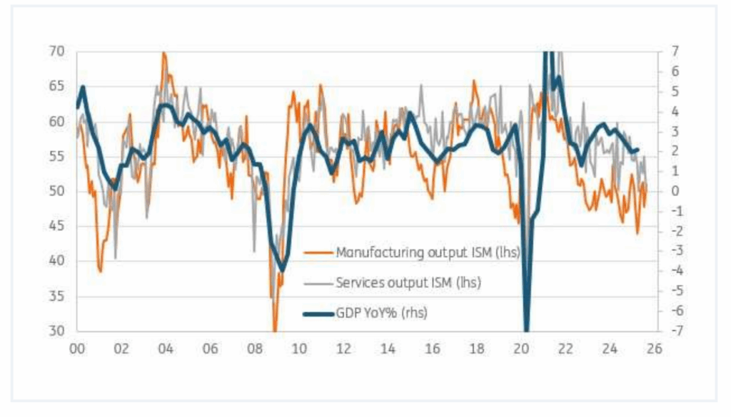 Por otro lado, el componente de empleo aumentó levemente a 47,2, señalando que la pérdida de puestos se desacelera aunque sigue siendo significativa. La relación histórica entre el ISM y el crecimiento anual del PIB sugiere riesgos a la baja para la expansión económica estadounidense en los próximos trimestres. En conjunto, el panorama apunta a una economía aún sólida pero en desaceleración, con fundamentos razonables y espacio para que la Fed mantenga una política de apoyo al crecimiento.