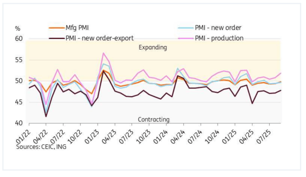 China: Recuperación Parcial y FrágilEl PMI manufacturero oficial de China repuntó a 49,8 en septiembre, su nivel más alto en seis meses, aunque se mantiene en zona de contracción por sexto mes consecutivo. Los nuevos pedidos avanzaron a 49,7, los pedidos de exportación subieron a 47,8 (máximo desde marzo), y el empleo mejoró a 48,5, el nivel más alto en siete meses. En contraste, el PMI de servicios cayó a 50,0, su punto más bajo del año, bordeando la contracción. Los nuevos pedidos de exportación repuntaron a 49,8, pero el resto de los componentes mostró retrocesos generalizados.