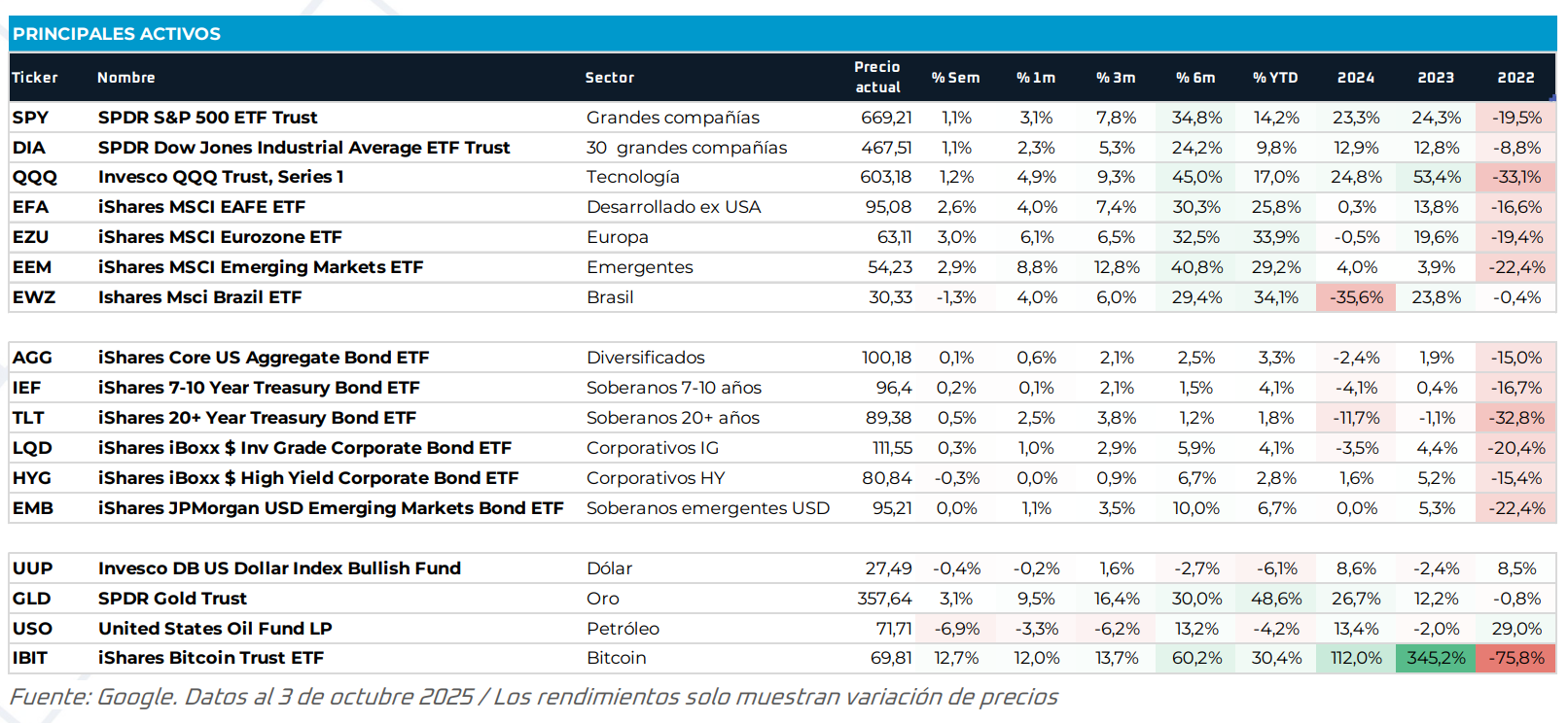 Estrategia de Mercado: Entre la Euforia y la ComplacenciaEl S&P 500 avanzó +1,1% en la semana, cerrando en 6.715,79 puntos, su máximo histórico semanal. El índice encadenó seis sesiones consecutivas al alza, en medio del cierre del gobierno estadounidense y de señales de debilidad en el mercado laboral. El contraste entre la euforia bursátil y el deterioro de los fundamentos se ha vuelto más pronunciado. Aunque los mercados suelen subir mientras “escalan el muro de las preocupaciones”, la desconexión actual entre precios y datos macroeconómicos refuerza la necesidad de prudencia.