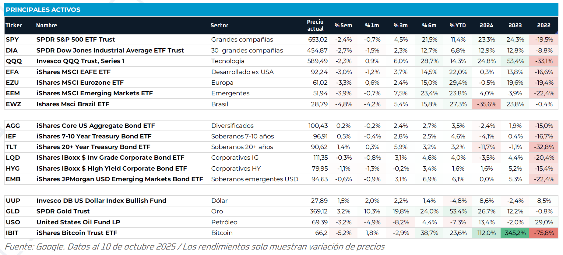 En renta fija, los bonos del Tesoro estadounidense mostraron recuperación moderada, con el TLT avanzando +1,4 % en la semana.